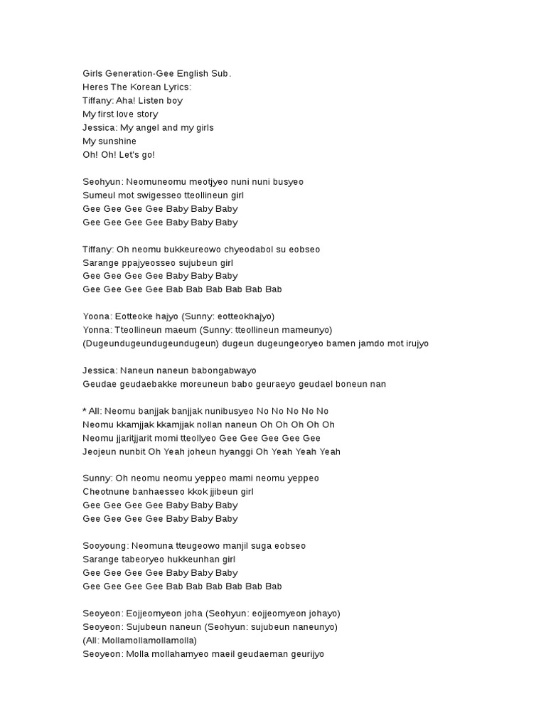 Girls Generation 소녀시대 - Gee Lyrics Romanization Korean Translation. Gee gee gee gee baby baby baby Gee gee gee gee. Leave a comment.